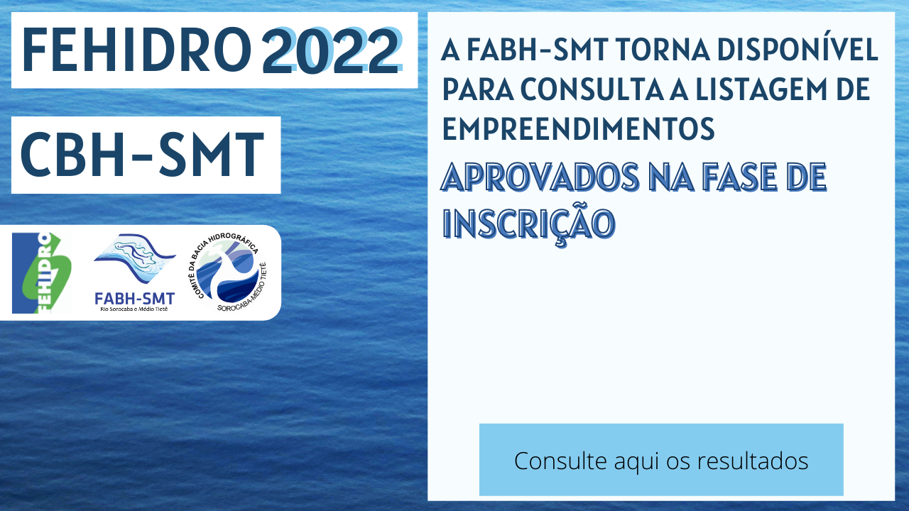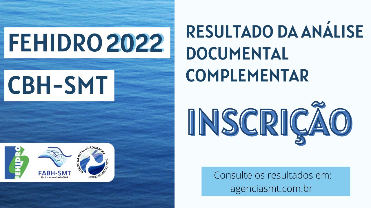 Em atendimento à Deliberação CBH-SMT n° 437/2021, a FABH-SMT torna disponível para consulta o resultado da análise documental referente à fase de INSCRIÇÃO dos empreendimentos candidatos a financiamento por meio de recursos financeiros do Fundo Estadual de Recursos Hídricos (FEHIDRO) na bacia hidrográfica do Rio Sorocaba e Médio Tietê.