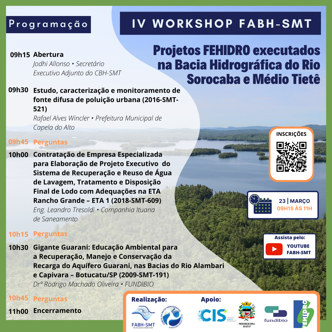 link) a partir das 9h15 de amanhã (23/03/22) e contará com a apresentação de três empreendimentos concluídos e financiados pelo Fundo Estadual de Recursos Hídricos (FEHIDRO). As inscrições podem ser realizadas por este formulário.