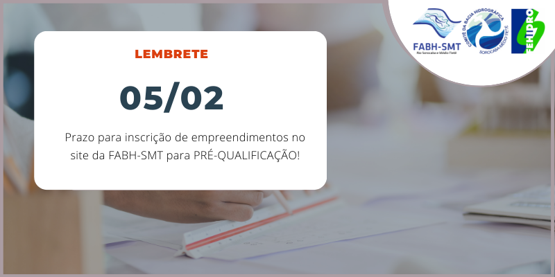 Conforme definido na Deliberação CBH-SMT n° 417/20 para inscrição, análise e hierarquização de pedidos de financiamento para obtenção de recursos financeiros do FEHIDRO na Bacia Hidrográfica do Rio Sorocaba e Médio Tietê, lembramos que o prazo para inscrição de empreendimentos no site da Fundação Agência da Bacia Hidrográfica do Rio Sorocaba e Médio Tietê • FABH-SMT (https://www.agenciasmt.com.br/fehidro.aspx), para PRÉ-QUALIFICAÇÃO, com a entrega, em forma digital termina dia 05/02/2021 (sexta-feira).