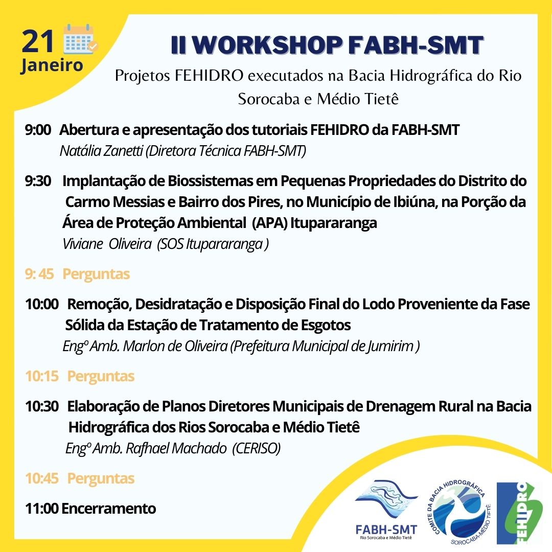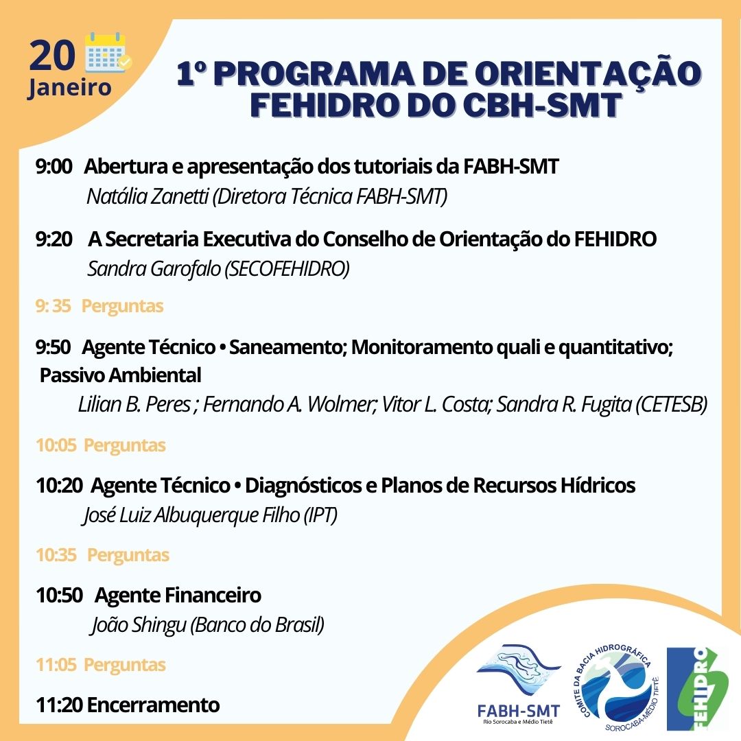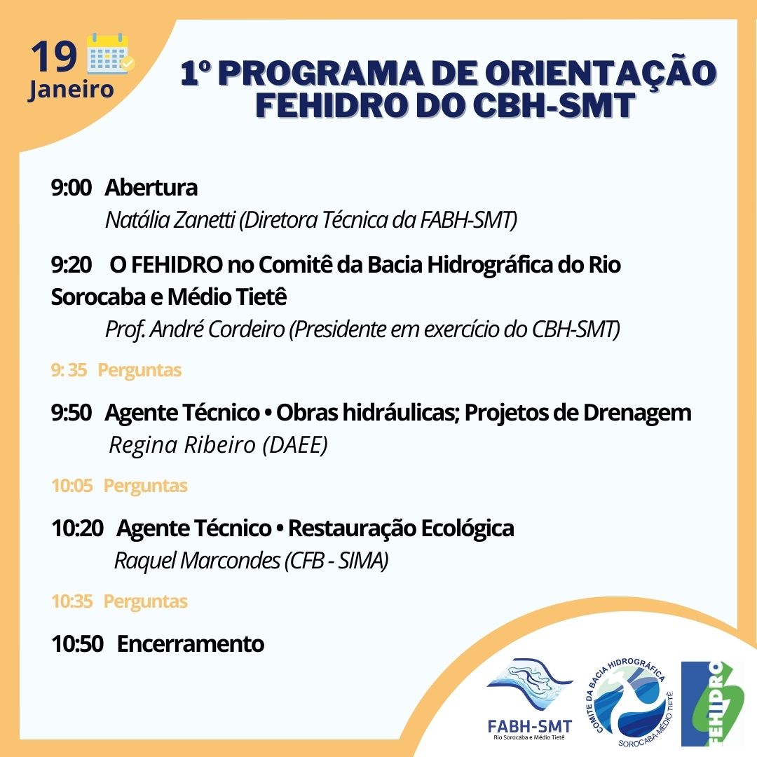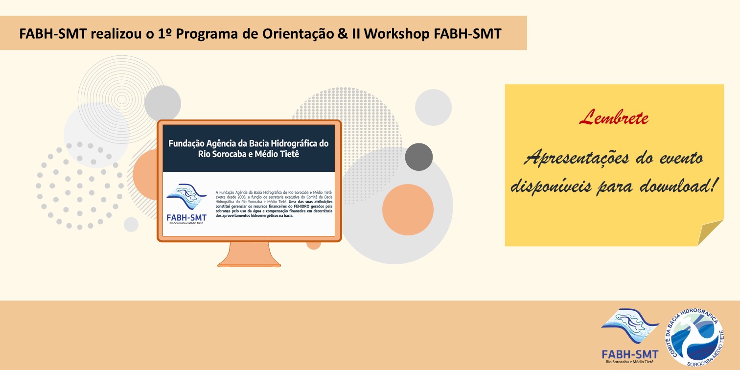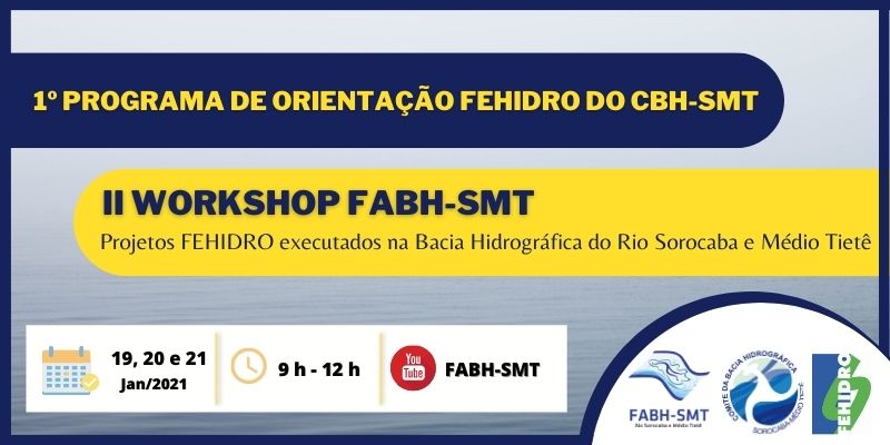 A Fundação Agência da Bacia Hidrográfica do Rio Sorocaba e Médio Tietê (FABH-SMT) possui como uma de atribuições gerenciar os recursos financeiros do Fundo Estadual de Recursos Hídricos (FEHIDRO).  Visando a melhoria contínua da gestão dos recursos na bacia, a FABH-SMT promoveu nas manhãs dos dias 19, 20 e 21 de janeiro de 2021, em parceria com o Comitê da Bacia Hidrográfica do Rio Sorocaba e Médio Tietê (CBH-SMT), o 1º Programa de Orientação FEHIDRO do CBH-SMT e II Workshop FABH-SMT: Projetos FEHIDRO executados na Bacia Hidrográfica do Rio Sorocaba e Médio Tietê.